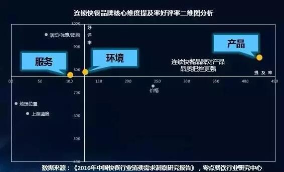 下圖所示,橫軸是提及率,縱軸是消費(fèi)者的好評(píng)情況,可以看到,連鎖快餐品牌的產(chǎn)品、環(huán)境和服務(wù)維度的好評(píng)率都較高,是三大優(yōu)勢(shì),由于品牌化,使得服務(wù)流程標(biāo)準(zhǔn)化、對(duì)產(chǎn)品品質(zhì)把控更強(qiáng),這三個(gè)維度更受消費(fèi)者認(rèn)可。