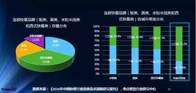 2、從市場(chǎng)存量去看,米粉米線類的連鎖店數(shù)較少,一線城市米粉米線品牌的品類內(nèi)競(jìng)爭較小