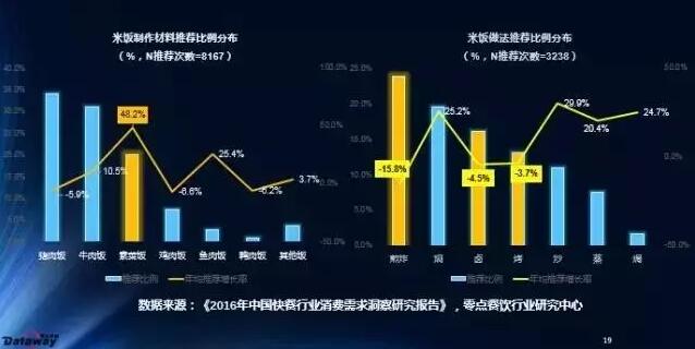 從制作材料來看,雖然現(xiàn)在還是以豬肉和牛肉飯推薦最多。但是,素菜類菜品受推薦的年均增長率為最高,也就是說,以素菜為主材料的產(chǎn)品越來越受消費(fèi)者認(rèn)可。