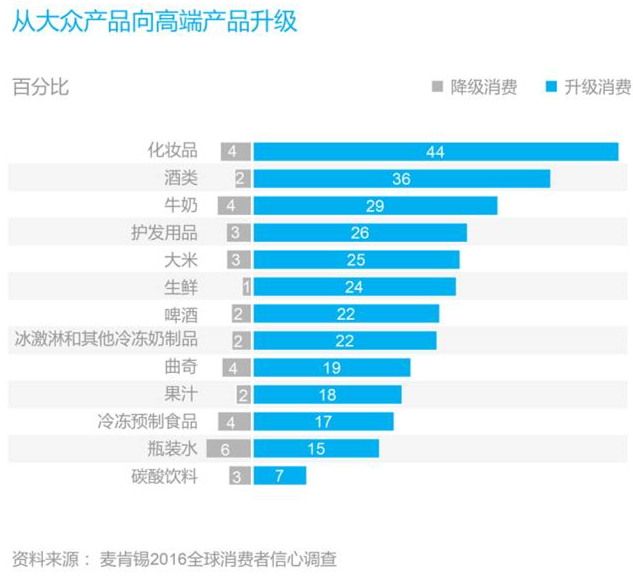 消費升級正呈現(xiàn)出旺盛的勢頭和活力,高端產(chǎn)品的品類增速超過了大眾產(chǎn)品和價值型產(chǎn)品的品類。而消費量—尤其是食品和飲料——則增長乏力。