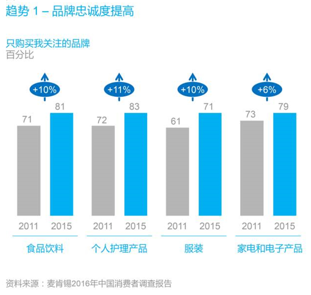 越來越多的中國消費者開始只關(guān)注少數(shù)幾個品牌,其中一些人則進一步鎖定某一個品牌。中國消費者并不很愿意在自己關(guān)注的品牌之外購買其他品牌。例如在服飾品類,愿意選擇備選品牌之外的消費者比例,已經(jīng)從2011年的約40%降至2015年的不足30%。