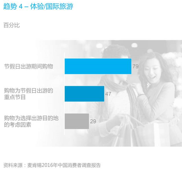 2015年中國出境旅游超過7000萬人,平均每人1.5次。購物是中國消費者境外游的“保留節(jié)目”:80%的消費者在海外購物,將近30%的人甚至根據(jù)購物機會來決定旅游目的地。
