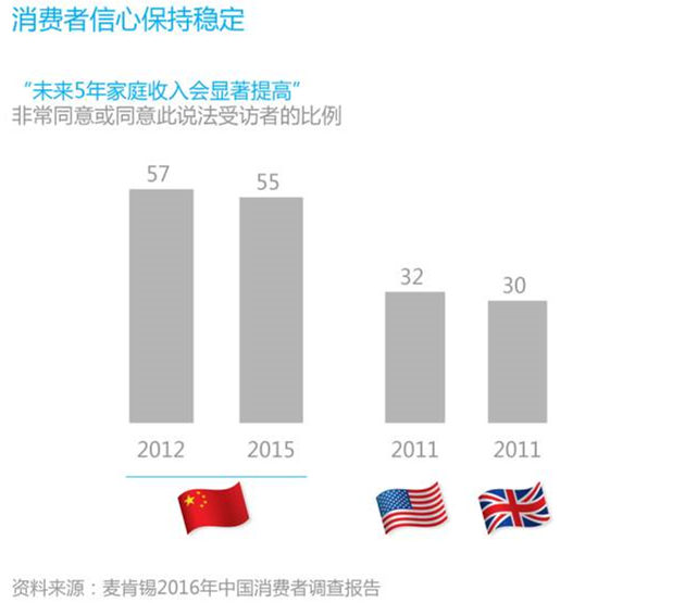 當被問及未來收入預(yù)期時,55%的受訪者相信未來五年中自己的收入將顯著增長,較2012年僅下降2個百分點。相比美國和英國,2011年持這一說法的消費者分別為32%和30%。