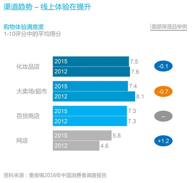 消費者對實體店的滿意度仍然比在線渠道高,但隨著網(wǎng)購越來越受歡迎,線上和線下渠道的滿意度差距正在縮小。
