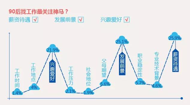 90后中,有83.5%的人表示不在乎加班。在找工作時,90后對工作時間關(guān)注度僅為1.4%,對社會地位的關(guān)注度僅為1.9%,位列前三的影響因素依次為:薪資待遇、發(fā)展前景、興趣愛好。