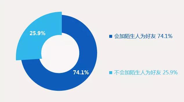 74.1%的90 后會在即時通訊軟件中,加陌生人為好友,25.9%不會加入陌生人。