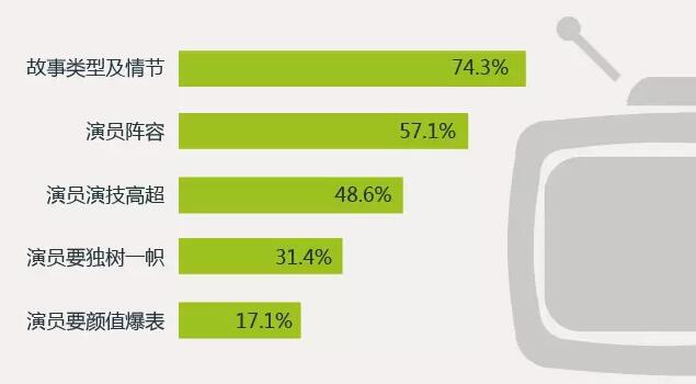 77.1%的90后觀眾認(rèn)為一部優(yōu)秀的電視劇大約在 10-30集最合適,恰好一部美劇的長度一般25集左右。在演員方面,48.6% 的90后認(rèn)為演員演技高超最重要,31.4%認(rèn)為演員要有自己的風(fēng)格,17.1%的認(rèn)為演員一定要顏值爆表。