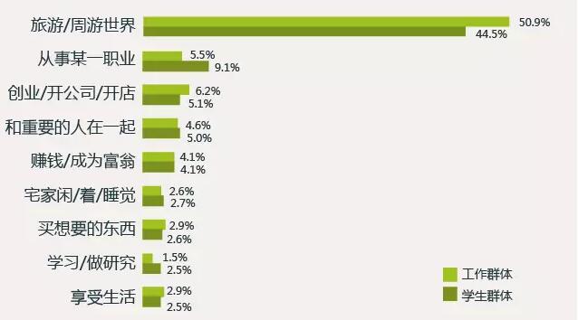 90后最渴望的事情是旅行,其中旅行愿望最為迫切的是工作中的90后,達(dá)50.9%,學(xué)生群體外出旅行的愿望為44.5%  “世界這么大,我想去看看”,90后出行不講究吃、住,更在意能夠深入了解當(dāng)?shù)厣?,增加見識和體驗(yàn)。近年來,窮游、驢行受到90后的追捧。