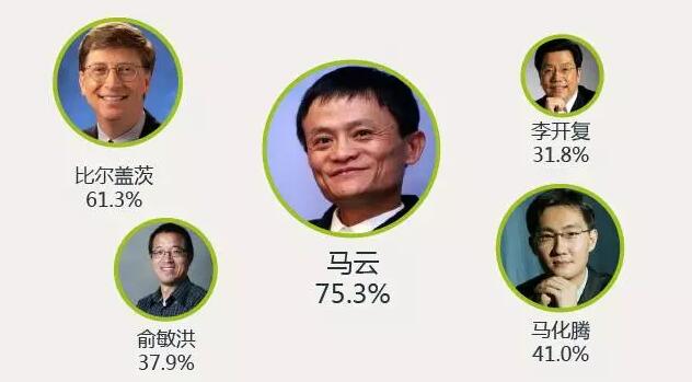 54.9%的90后崇拜商界精英,領(lǐng)袖偉人緊隨其后為31.2%。在商界精英中,馬云威望最高,為75.3%,比爾蓋茨61.3%,馬化騰41.0%。