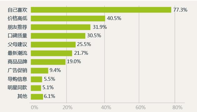 在日常購物時,77.3%的90后會注重自己是否喜歡, 40.5%會關(guān)注價格高低,31.9%會受到朋友推薦的影響。