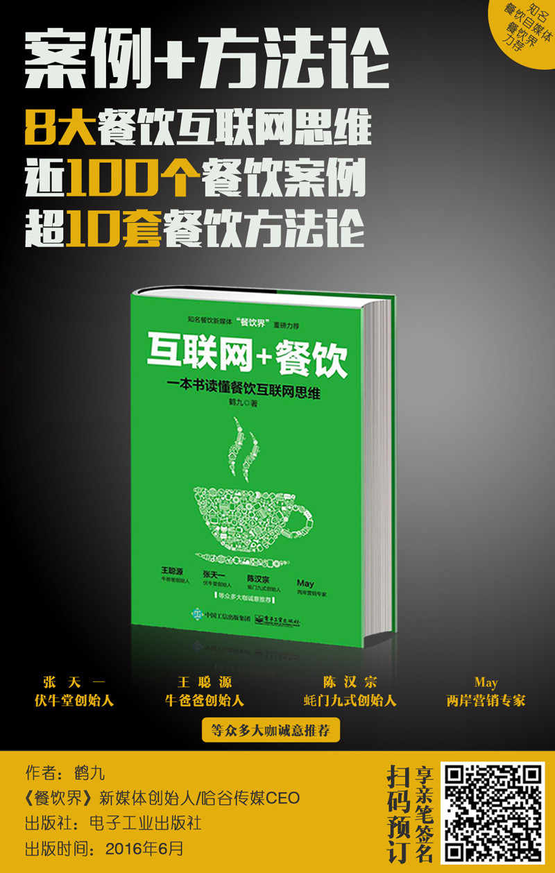 6月6日起,《“互聯(lián)網(wǎng)+餐飲”:一本書讀懂餐飲互聯(lián)網(wǎng)思維》將于線上正式開啟預(yù)售。伏牛堂創(chuàng)始人張?zhí)煲?、牛爸爸?chuàng)始人王聰源、蠔門九式創(chuàng)始人陳漢宗、兩岸營銷專家MAY等眾多大咖熱薦的誠意之作,跟上互聯(lián)網(wǎng)的步伐刻不容緩!趕緊掃描二維碼參與預(yù)定吧!