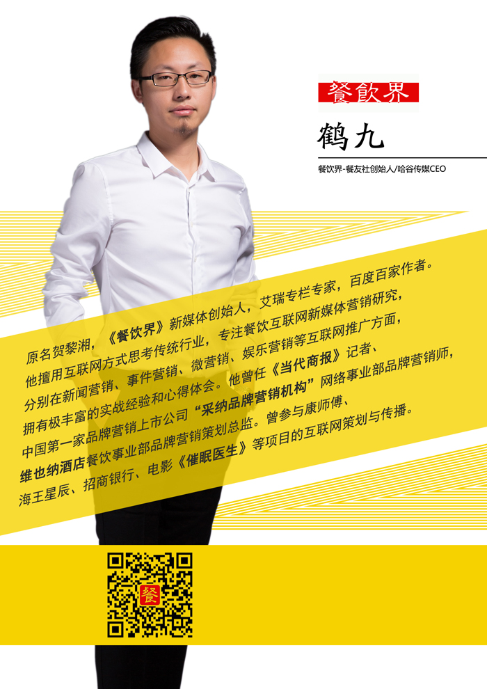 作為知名餐飲自媒體人,“餐飲界”創(chuàng)始人鶴九將自己親身經(jīng)歷的經(jīng)驗與知識進行系統(tǒng)的梳理,并對多年總結(jié)而來的餐飲互聯(lián)網(wǎng)思維精華進行了提煉,撰寫了《“互聯(lián)網(wǎng)+餐飲”:一本書讀懂餐飲互聯(lián)網(wǎng)思維》一書。
