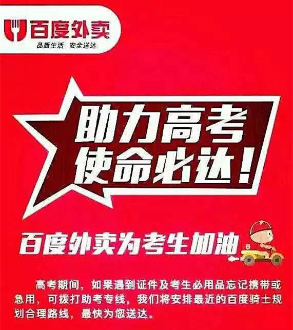 百度外賣對外宣稱,今年高考期間將全線助力,凡是遇到證件及考生必用品忘記攜帶或急用,可撥打百度外賣的助考專線,服務(wù)中心將安排最近的百度騎士規(guī)劃合理路線,以最快的速度為考生送上遺漏物品。