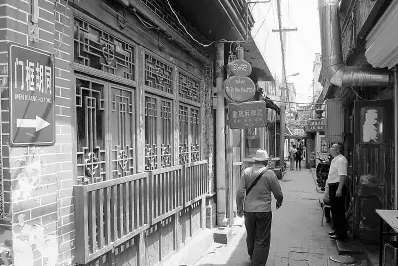 現(xiàn)在的游客慕名前往大柵欄,但很少有人特意去逛一逛門(mén)框胡同。老北京民諺有一句——“東四西單鼓樓前,王府井前門(mén)大柵欄,還有那小小門(mén)框胡同一線天”。如今,與修葺一新的大柵欄商業(yè)街相比,隱藏在繁華背后的門(mén)框胡同顯得蹩腳了很多。“一線天”還在,但是屋檐上爬滿了油煙落下的黑灰。常年沒(méi)人打理的雜亂電線,把“一線天”分割成不規(guī)則的形狀。