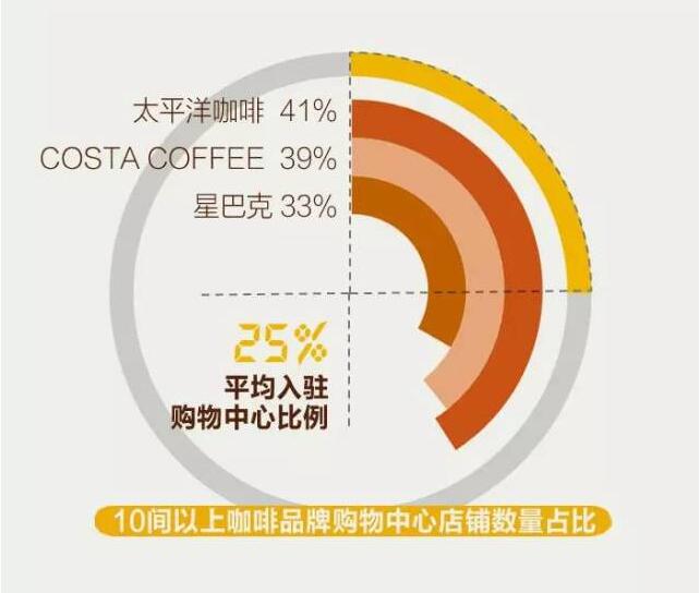 根據(jù)前文數(shù)據(jù)顯示,樣本所有咖啡品牌入駐購(gòu)物中心的店鋪占比僅有13%,而開(kāi)店10間以上的連鎖咖啡品牌卻有25%的門(mén)店分布在了購(gòu)物中心里,上升了12個(gè)百分點(diǎn)。單就太平洋、星巴克和COSTA而言,其入駐購(gòu)物中心的比例分別高達(dá)41%、39%和33%。