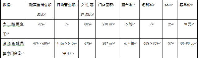 (注1:①②數(shù)據(jù)來源于品牌方;注2:漁語魚門店數(shù)據(jù),“﹥”符號連接的是變革前后的數(shù)據(jù),如“4.5萬﹥6.5萬”指轉(zhuǎn)型為酸菜魚專門店后,日均營業(yè)額由4.5萬提升至6.5萬)