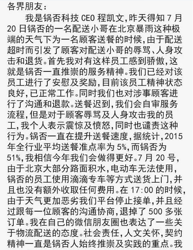 比如7月20日,北京下大暴雨。一家叫鍋否科技主營外賣火鍋的企業(yè),處理了這樣一個“突發(fā)”事件: