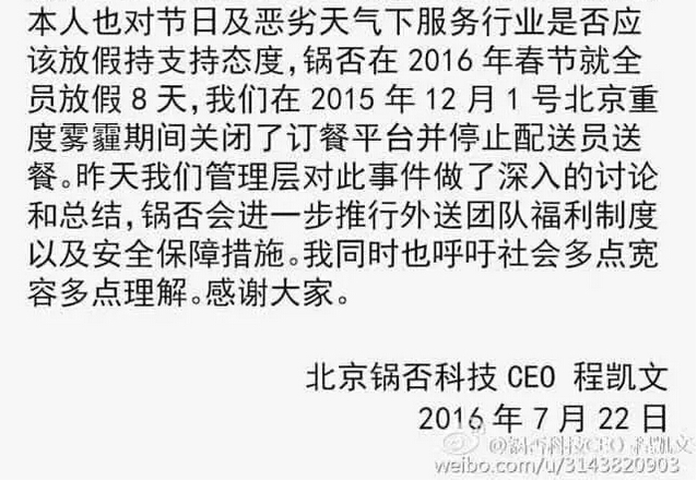 聯(lián)合創(chuàng)始人宋洋也同時發(fā)聲:“鍋否快遞小哥遲到被罵的事,我們調(diào)查清楚了,按流程對客人進(jìn)行了遲到賠償,但并沒有對配送員進(jìn)行處罰,對昨天所有冒雨工作的配送員,都進(jìn)行了獎勵。出于保護(hù)兩位當(dāng)事人的隱私權(quán),希望大家不要再去人肉或者聯(lián)系小哥。最后,我們想呼吁社會,請理解下每天為大家服務(wù)的配送員,他們很辛苦。”