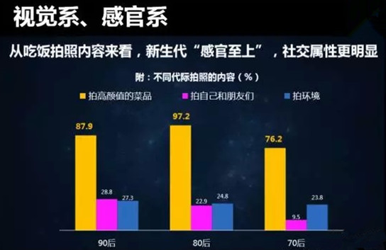 因此可見,在外就餐照片的共享已經成為新生代圈子里重要的互動方式之一。90后是追求全方位感官刺激的視覺系群體,而且他們覺得吃飯這個事情就是要和玩到一起去,他們更注重有人情味的和好玩的方式。