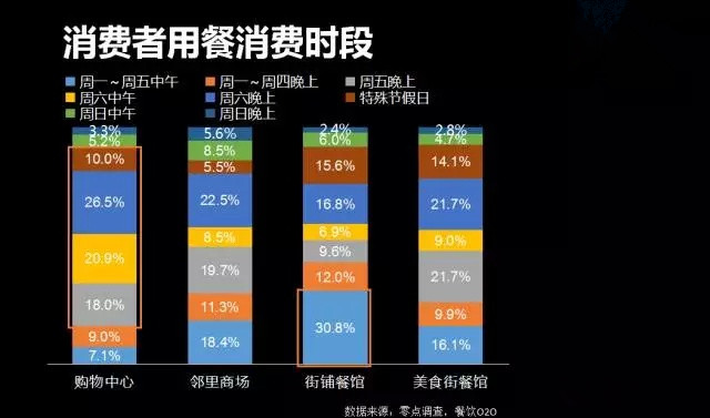 2、購物中心餐飲消費時段集中在周五晚至周六晚和節(jié)假日,占比近75%,周日和平時人流下滑。購物中心是餡餅還是陷阱?