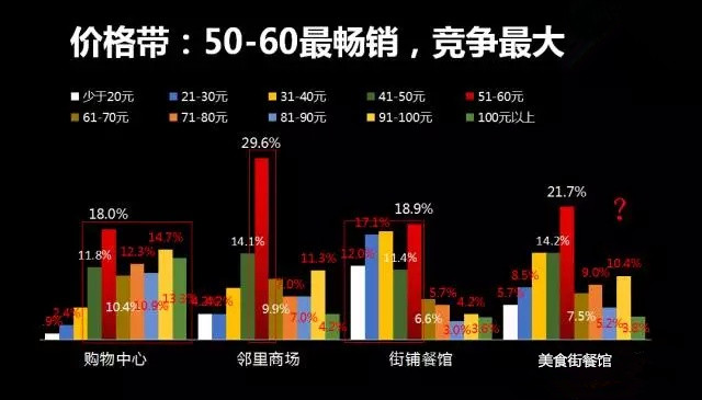 5、美食街的價格帶呈非正態(tài)分布,沒有明顯的定位,各種價格均有不等表現,說明依市場選擇來定位,客群不確定。