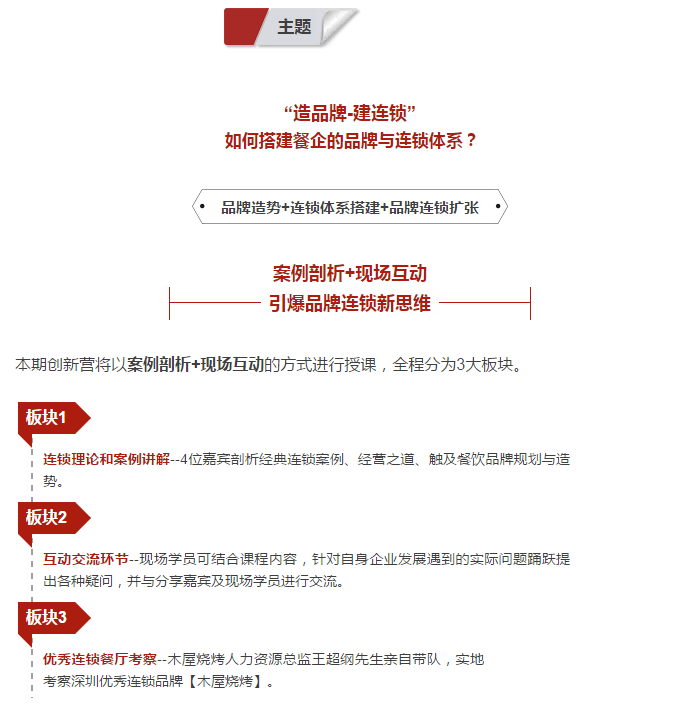 本期創(chuàng)新?tīng)I(yíng)將邀請(qǐng)4位在品牌塑造和連鎖經(jīng)營(yíng)上頗有心得的業(yè)內(nèi)人士參與,從餐飲品牌規(guī)劃、餐飲品牌造勢(shì)、連鎖體系、連鎖餐飲品牌經(jīng)營(yíng)之道等角度,全面覆蓋連鎖營(yíng)銷(xiāo)關(guān)鍵點(diǎn)。